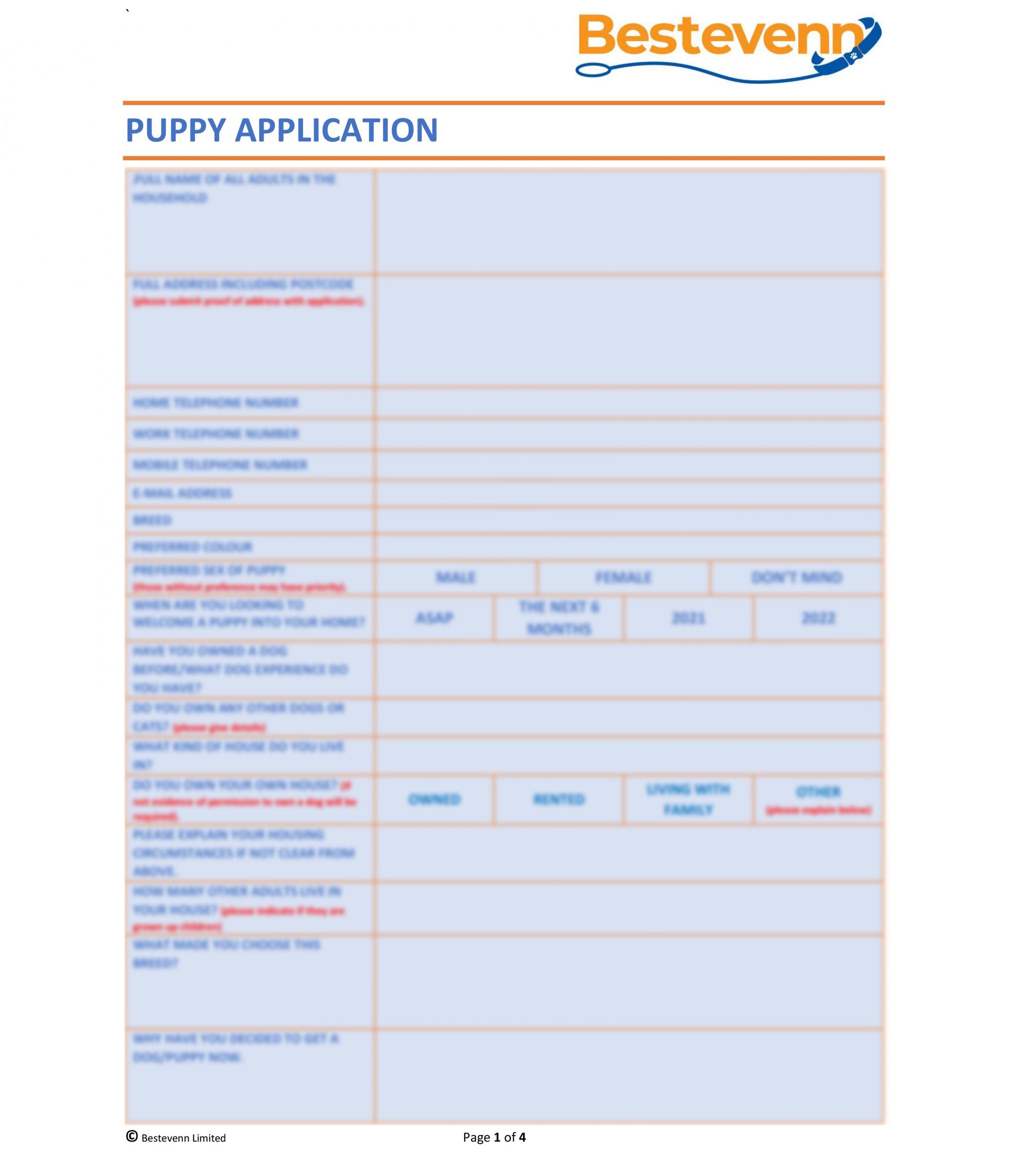 A screening application form for breeders to send to potential puppy families in order to get information about them to determine if they would be suitable for one of your puppies.
